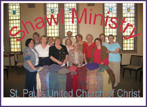 From early March to Mid-May 2005, more than 20 women from St. Pauls UCC[1] on the north side of Chicago, IL met weekly to knit and crochet collectively for the Shawl Ministry. During our weekly gatherings, we prayed, laughed, cried, snacked, shared, cared, and blessed materials, work, and completed shawls. We discovered that we were gifting ourselves as well as the Women’s Support Program of the CRMHC in Hartford CT. We are delighted to have shipped 20 shawls to the program in May 2005. Our interface with the program director, Rocio Chang, has been a memorable and meaningful experience of feeling her presence and caring connection throughout our journey. The photograph above is taken at the shawl blessing ceremony held on May 22, 2005. On that day, using the theme of Epiphany and three wise women, we: