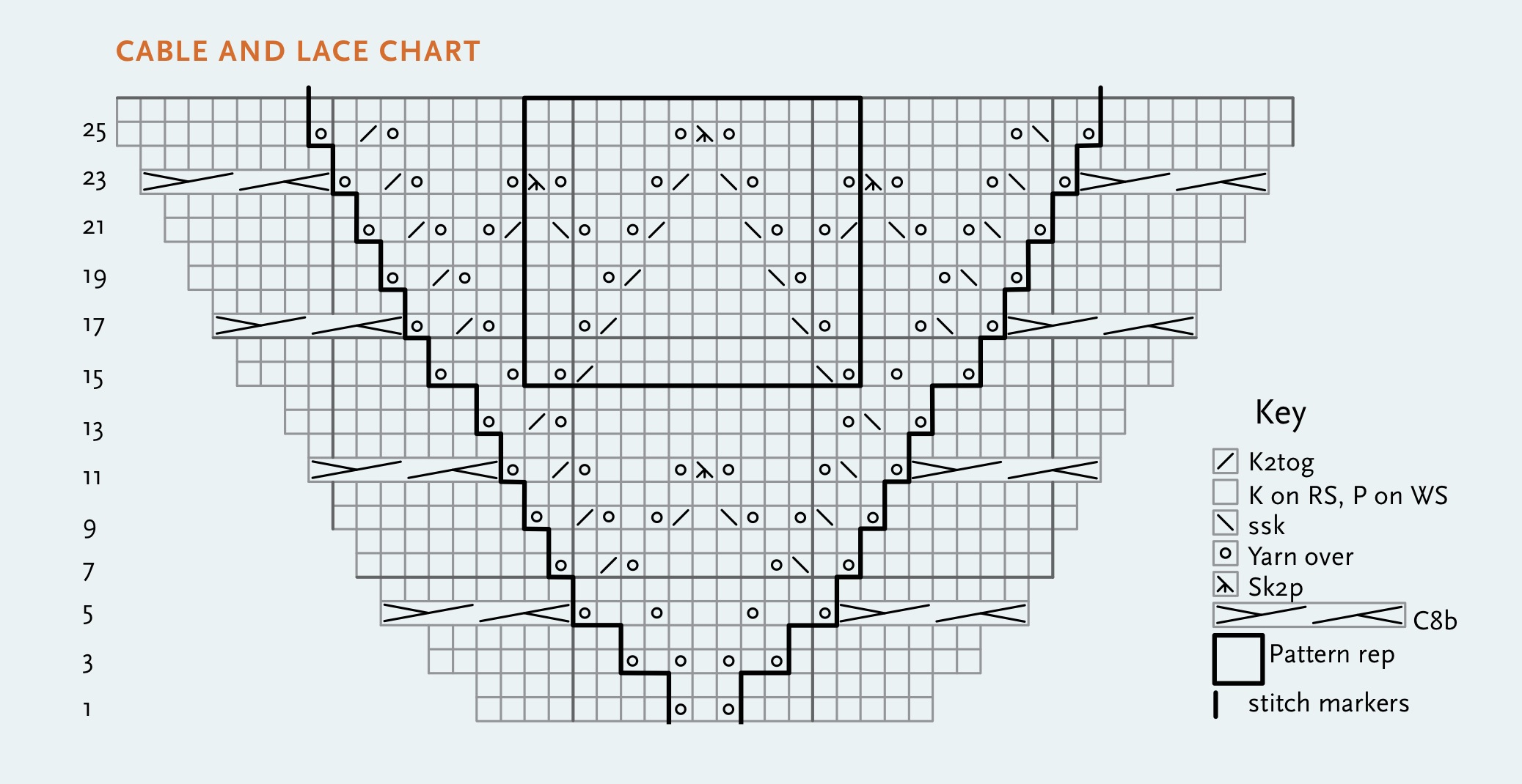 Above is the new/corrrected chart. In the original printing of the New Prayer Shawl Companion, "the chart repeat should be 1 stitch smaller. The right edge of the repeat box should be brought 1 stitch to the left. Also, the (original) chart doesn't represent the frm the markers that is present in the written instructions." Kristen TenDyke