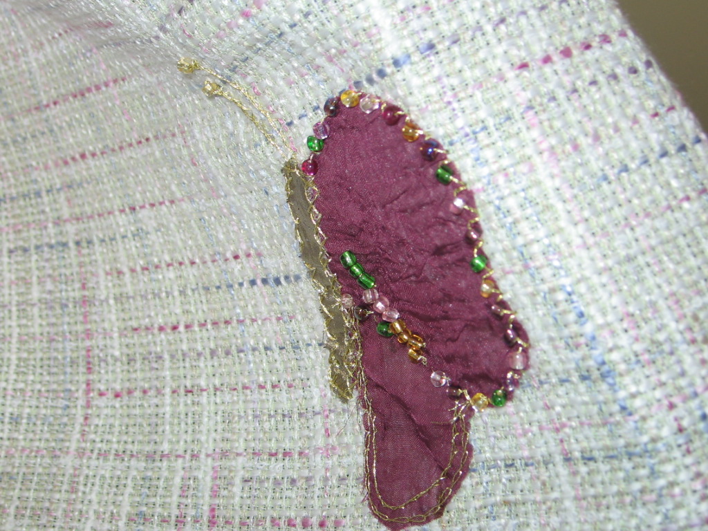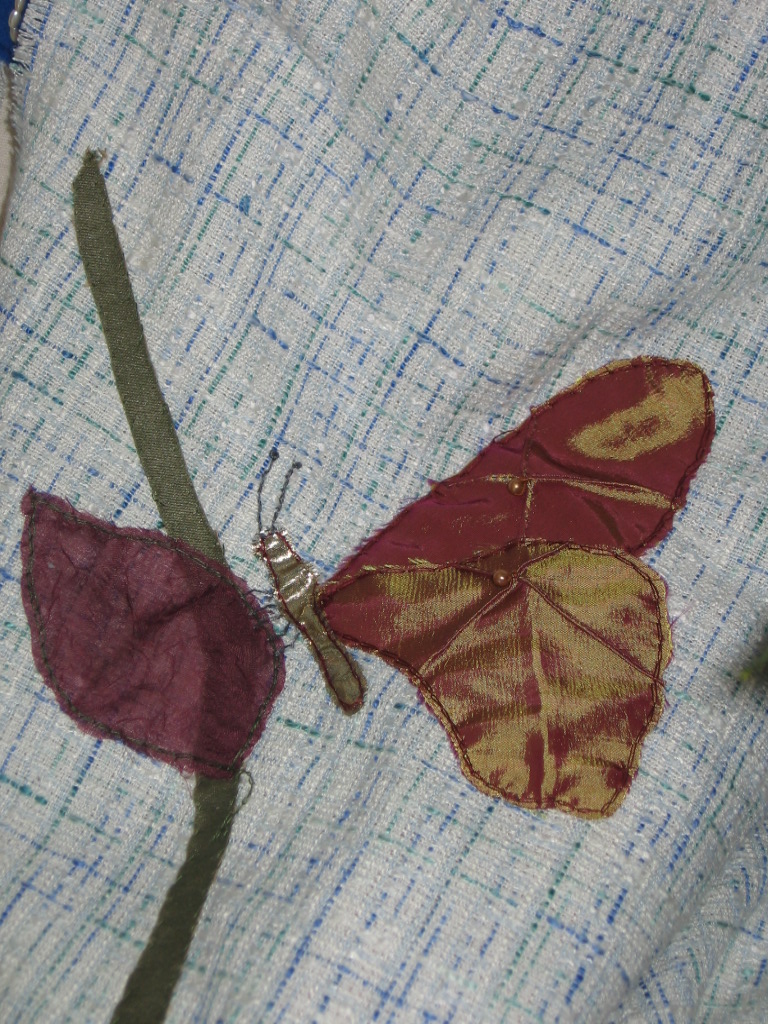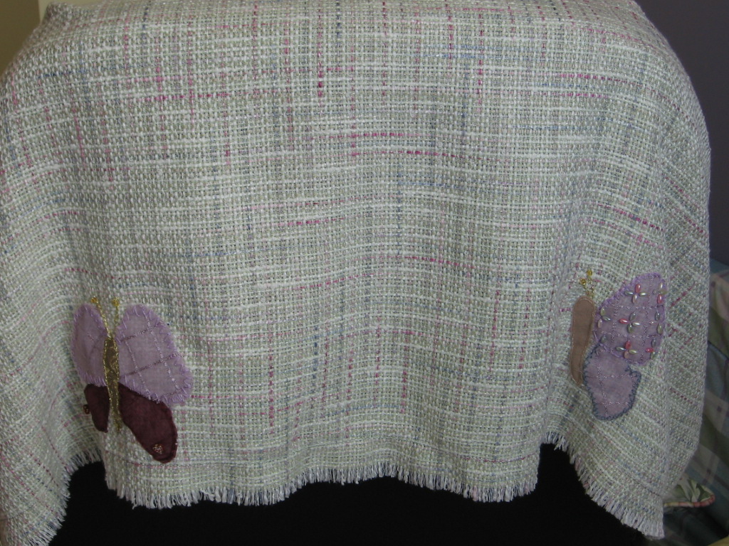 Butterfly Shawl -----hope, beauty, transformation. I created this shawl just to show women how they can take a piece of fabric and add to it by appliqué. A lot of the beading is done in threes, there are six butterflies on the shawl, one on each side where the arms would be, one at the neck, two at the bottom reaching for the sky. Fabric has lots of green in it for nature.