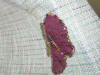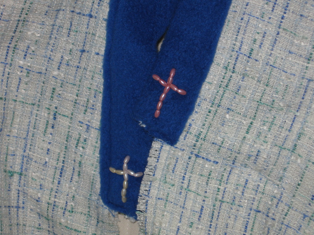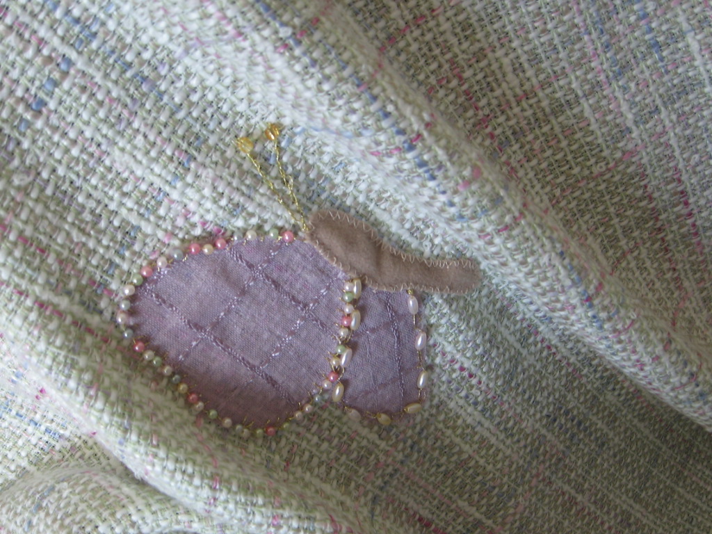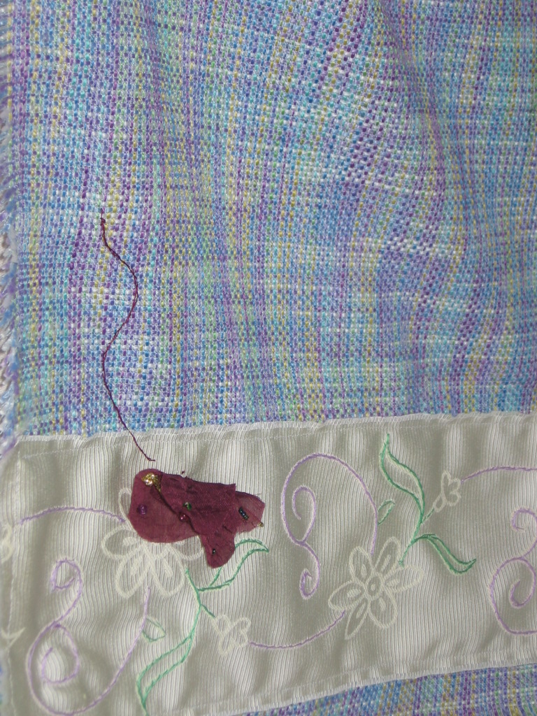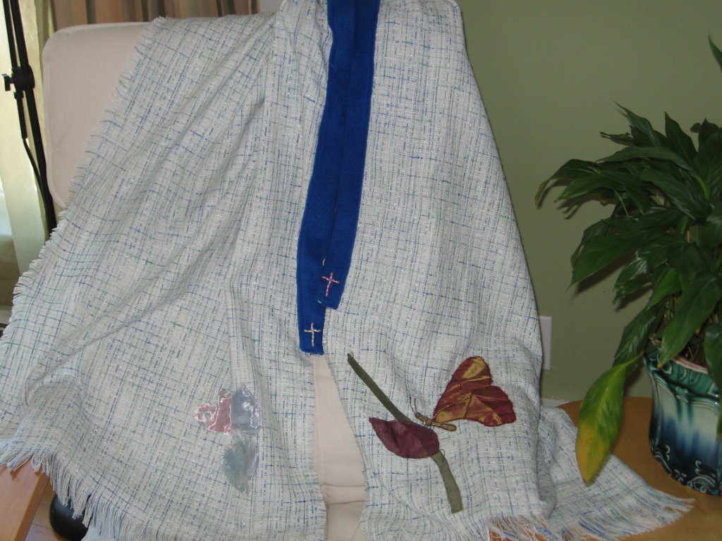 Desert shawl was created for a friend that is dry period, spiritually. The butterfly, stem and leaf were appliqué using embroidery thread and the butterfly is resting, waiting but feeding or being fed. The three hearts are appliqué as well, meaning Father, Son and Holy Spirit. Crosses are pearl beads and symbol of our Catholic faith.