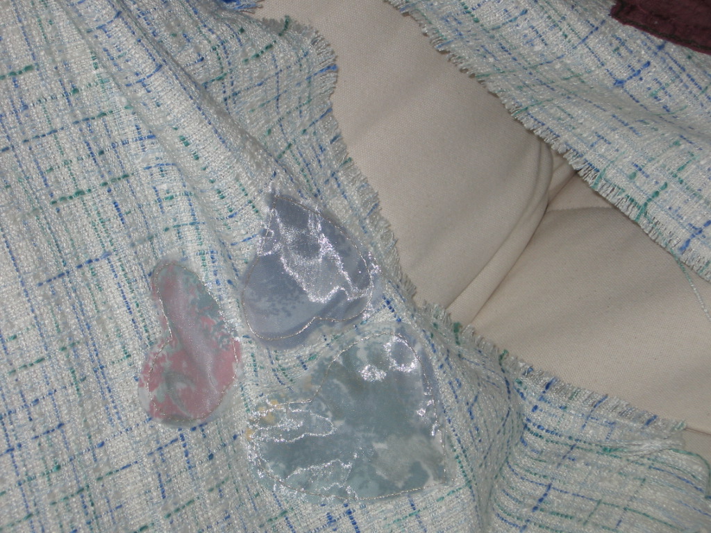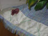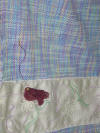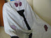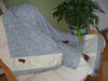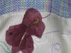 Spring Shawl was created for a 21 year old young woman who has been diagnosed with cancer. The colors used on the shawl are symbolic of Easter, spring-- when all blooms, hope of better things to come. Butterflies--symbol of hope, color purple--symbol of faith, green--new growth. The flowers I didn't embroidery because I don't believe she would want to see flowers at this time. I suggested in my note that she use fabric crayons and color them in later.